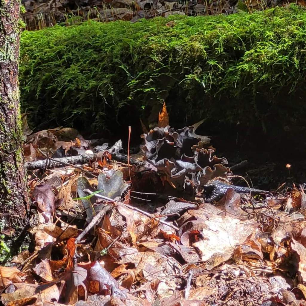 “Black trumpet” is one of many common names for Craterellus fallax(If you’re in the US) and Craterellus cornucopioides(If you’re in Europe.) They are also known as black chanterelle, trumpet of the dead, horn of plenty or horn of death. In this post, I’ll be primarily focused on Craterellus fallax, though the differences between the two are minor. Both are small, funnel shaped mushrooms that are generally black or dark brown inside the funnel and gray on the outside with veins, as opposed to gills. In spite of Craterellus fallax’s gloomy exterior, the spore print is more sunshiny ranging from yellow-orange to pink-orange. Their scent is described as dark and sweet like overripe apricots. Being shadow-colored and growing only 1 to 4 inches tall, black trumpet can be difficult to spot among the forest litter. So it’s important to know when and where to look.